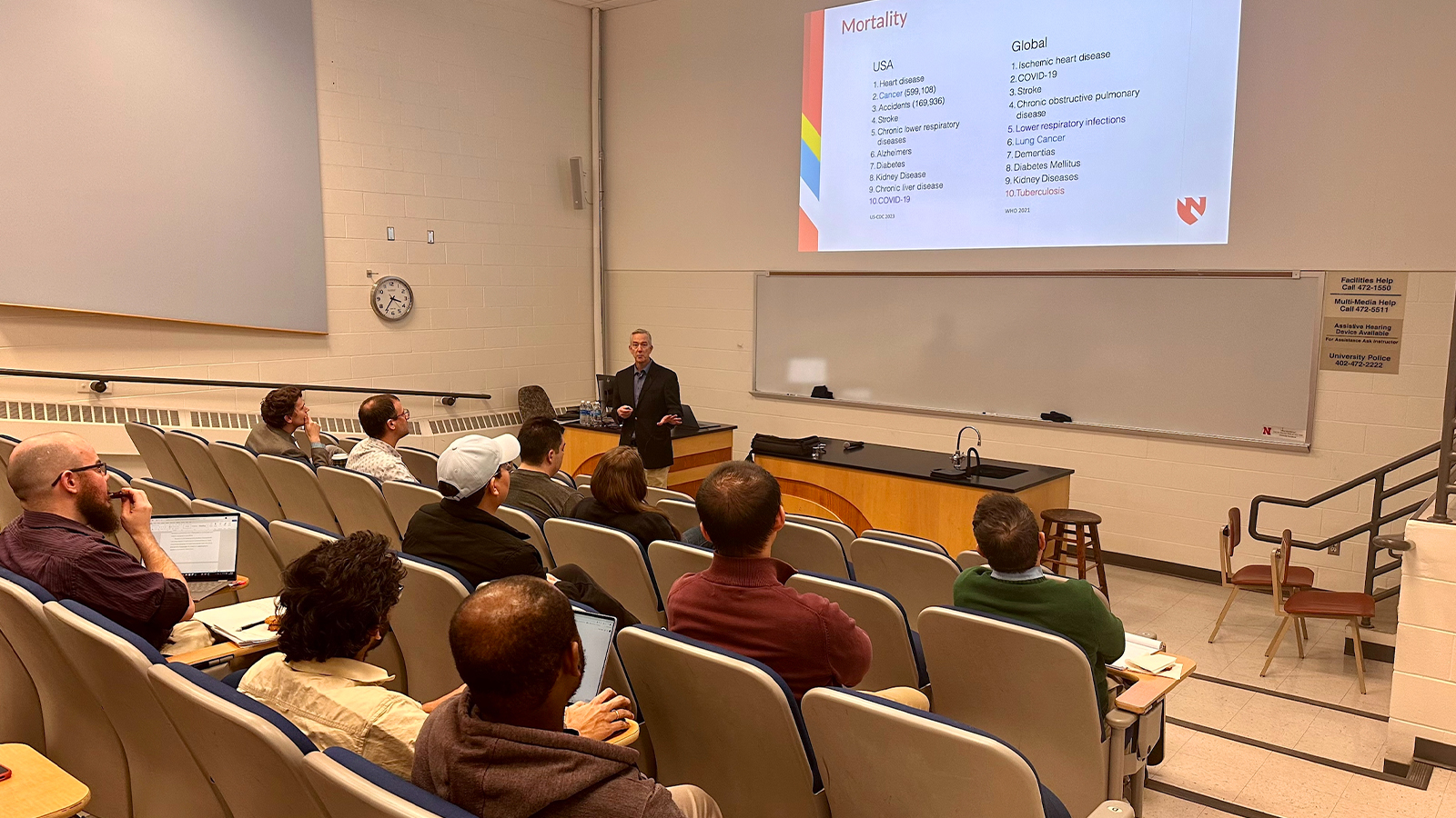 Professor Don Ronning of the University of Nebraska Medical Center presents during the final chemistry colloquium of the semester on Dec. 12.