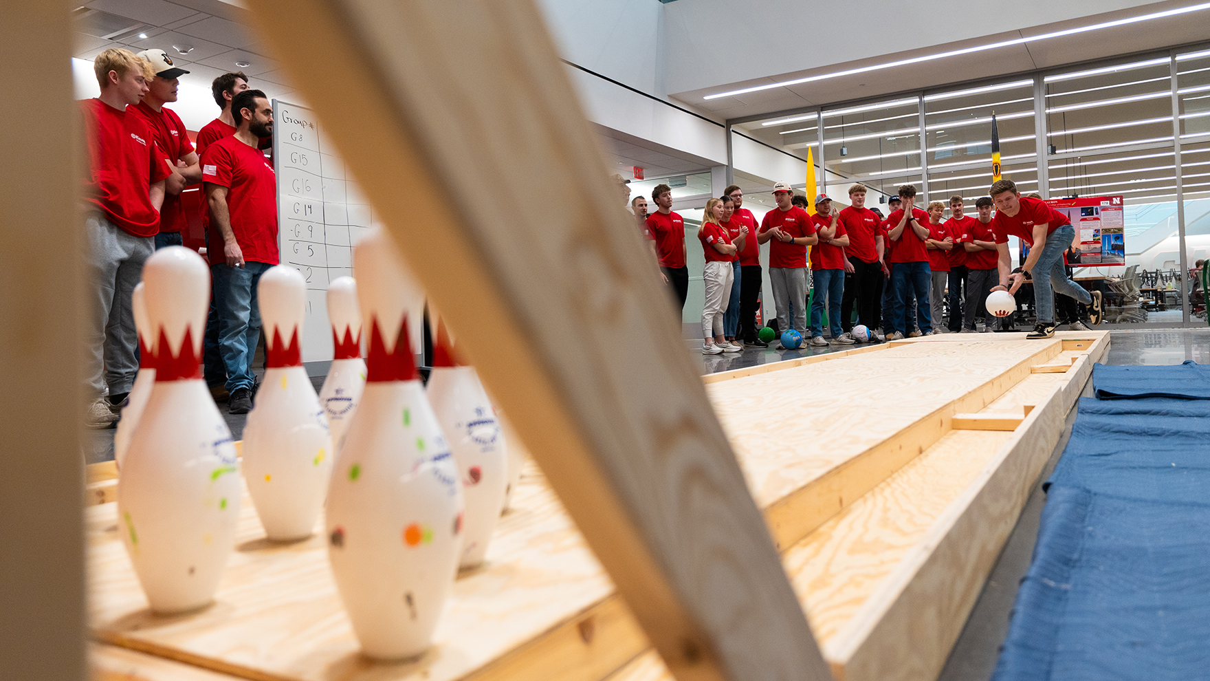 Brandon Mohr, a junior construction management major, throws his group’s Wilson-themed concrete bowling ball during the College of Engineering’s annual concrete bowling event on Dec. 12. His teammates watch as the ball rumbles down the lane.
