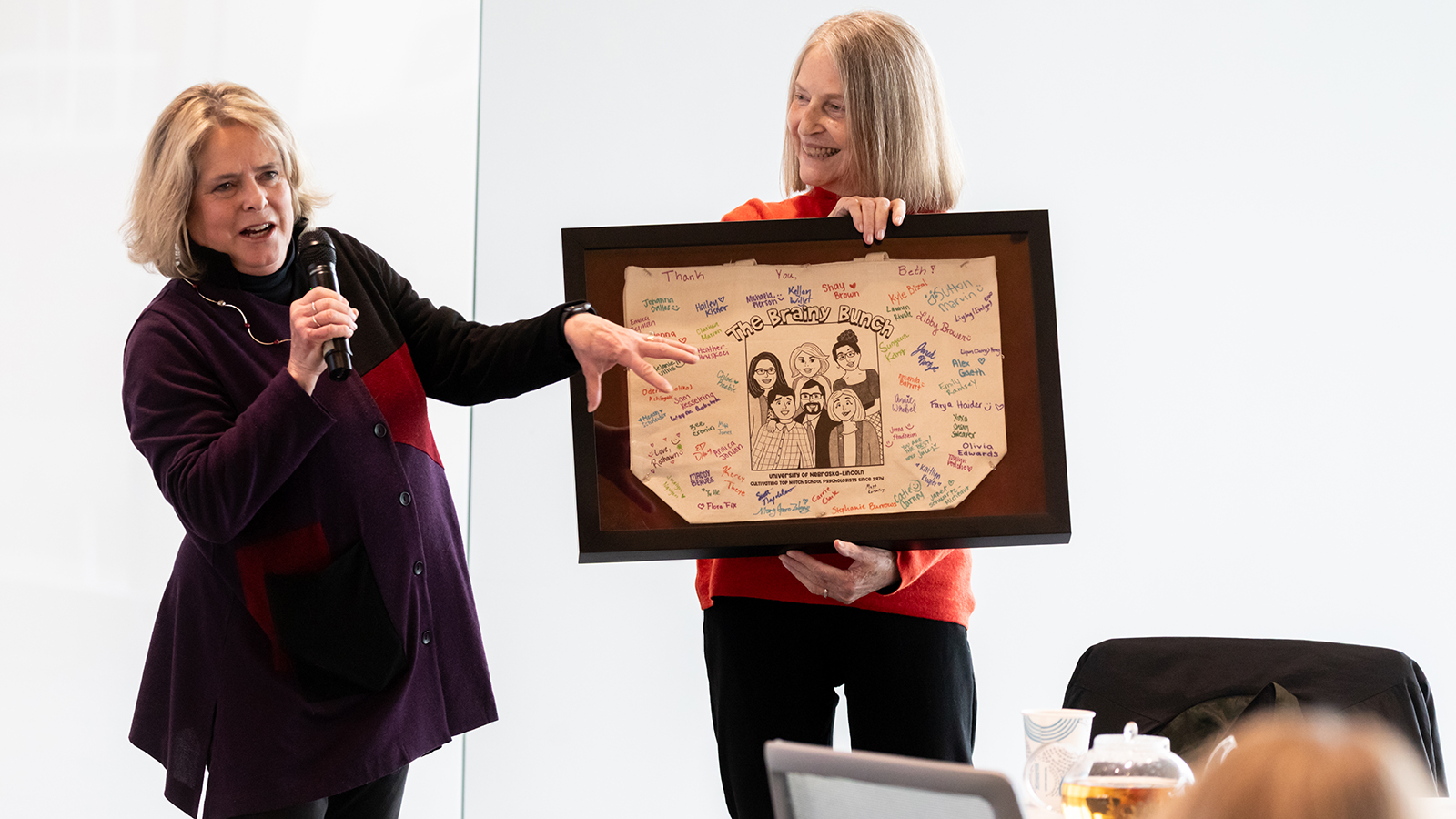 The College of Education and Human Sciences recently celebrated the 25-year career of Beth Doll (right). During the ceremony, Susan Swearer (left) presented Doll with a framed and signed "Brainy Bunch" bag. Doll's career included five years as the college's associate dean for academic affairs and two years as interim dean. Doll retires this month from the Department of Educational Psychology.