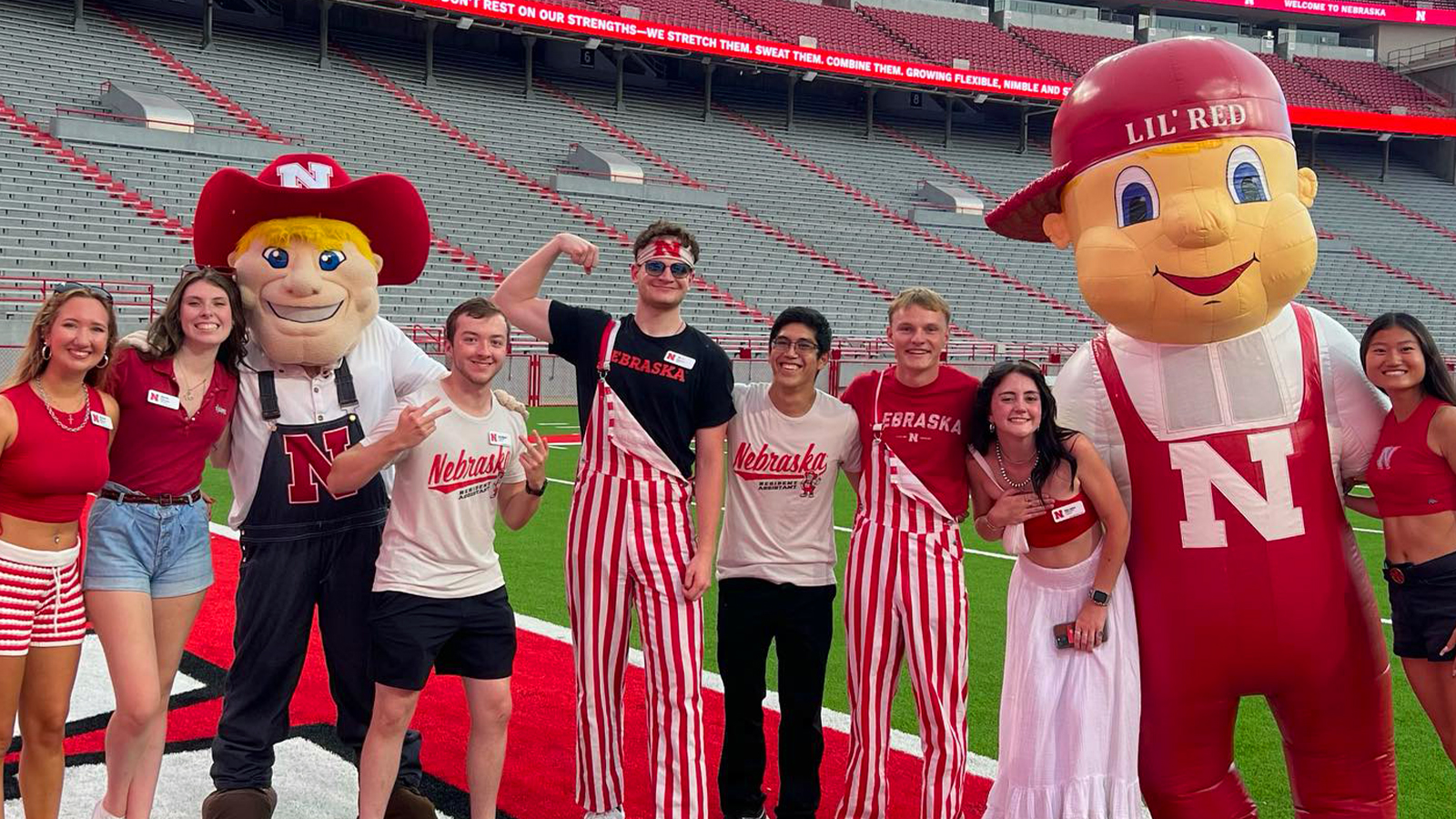 Chloe Zarp, a senior double major in psychology and biological sciences, celebrated the start of the semester with fellow resident assistants and the Husker mascots during a stop in Memorial Stadium. Learn more at https://go.unl.edu/0kvs.