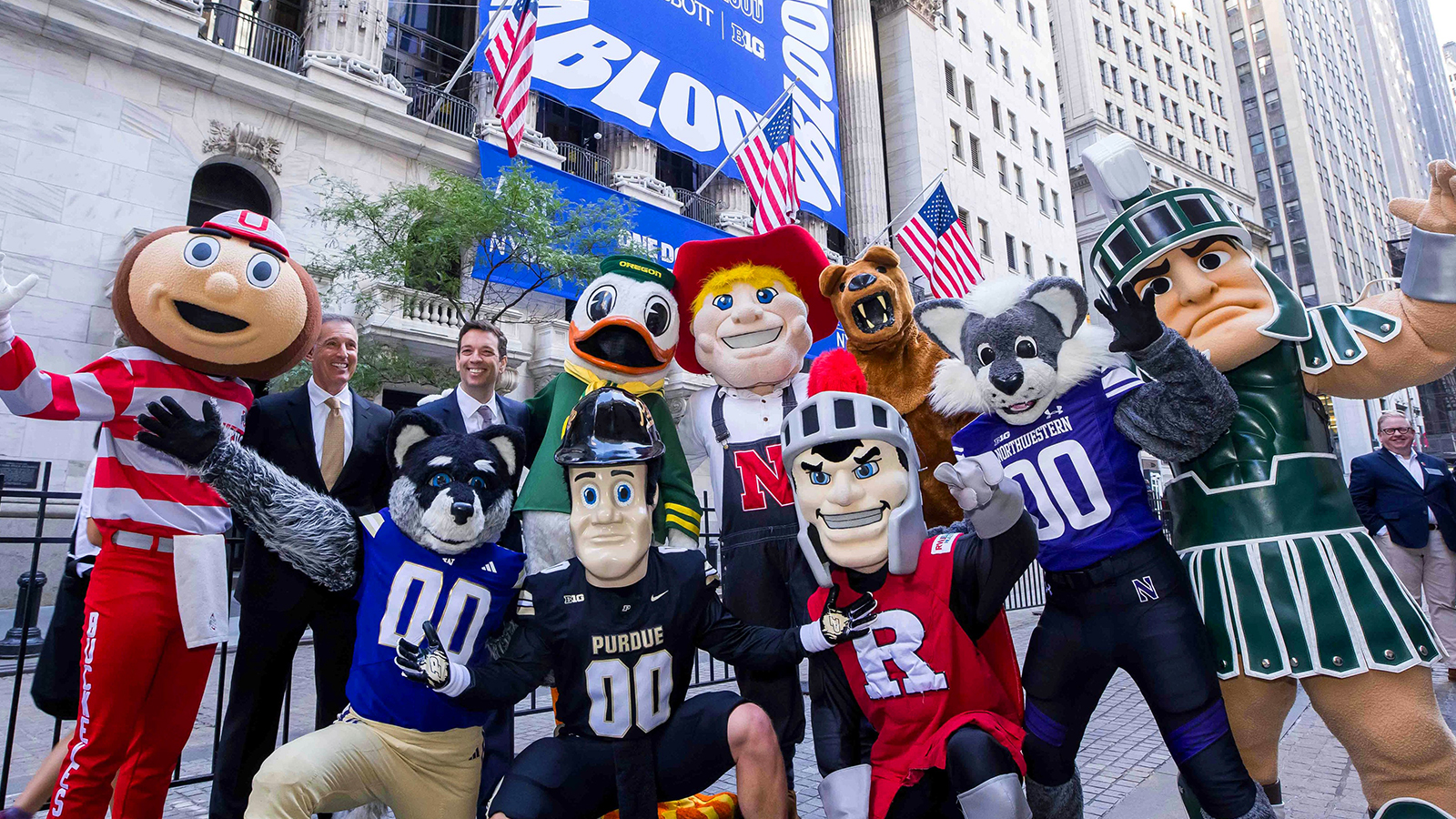 Big Ten mascots gathered to celebrate outside the New York Stock Exchange as part of the launch of the 2025 “We Give Blood” campaign sponsored by Abbott and the Big Ten Conference. Learn more at https://go.unl.edu/0yfn.